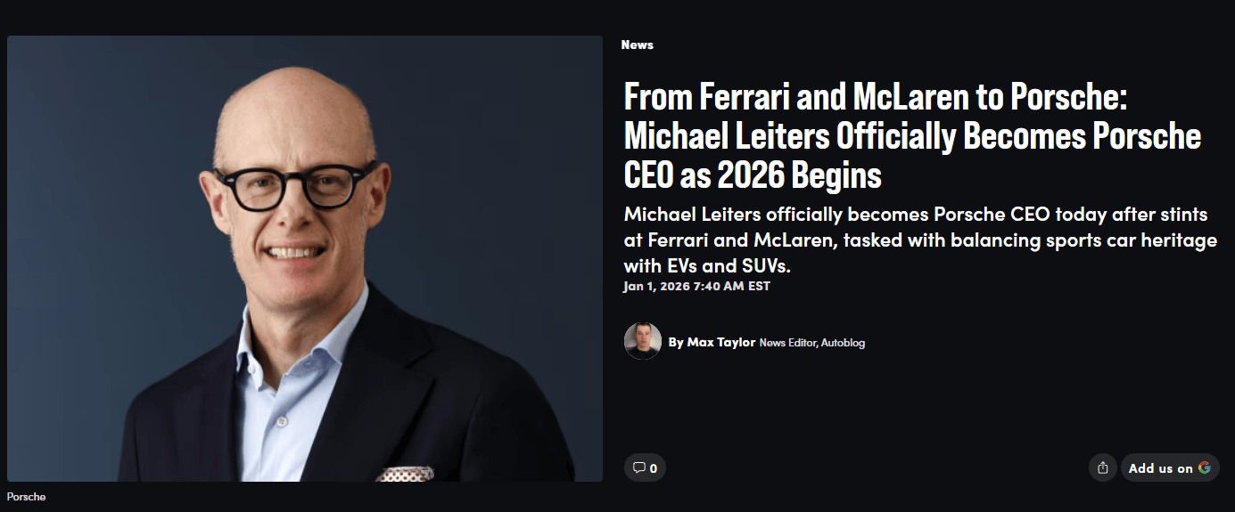 猫头鹰车志(ID:owlauto)讯,据媒体报道,自2026年1月1日起,保时捷完成CEO人事更迭,执掌品牌10年的奥博穆正式卸任,由前迈凯伦CEO迈克尔·莱特斯接任。
