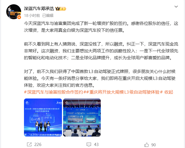 据猫头鹰车志了解,邓承浩发文澄清传闻,强调此次增资是股东对深蓝的“信任票”,资金将精准投向下一代全球领先的智能化和电动化技术,以及全球化品牌提升。