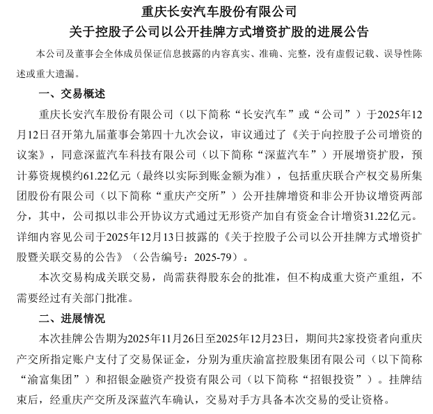 猫头鹰车志(ID:owlauto)讯,深蓝汽车2026年1月8日在渝富智造“6213”行动计划推进暨项目签约会上,与重庆渝富控股集团完成增资扩股签约,标志着其61.22亿元C轮融资流程正式落地。