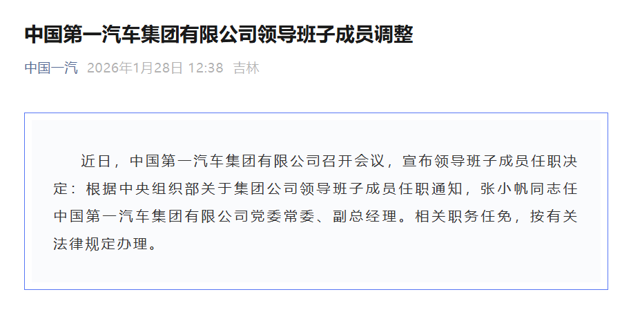 猫头鹰车志(ID:owlauto)讯,中国第一汽车集团有限公司1月28日召开会议,宣布领导班子成员任职决定,根据中央组织部相关通知,张小帆正式出任中国一汽党委常委、副总经理。