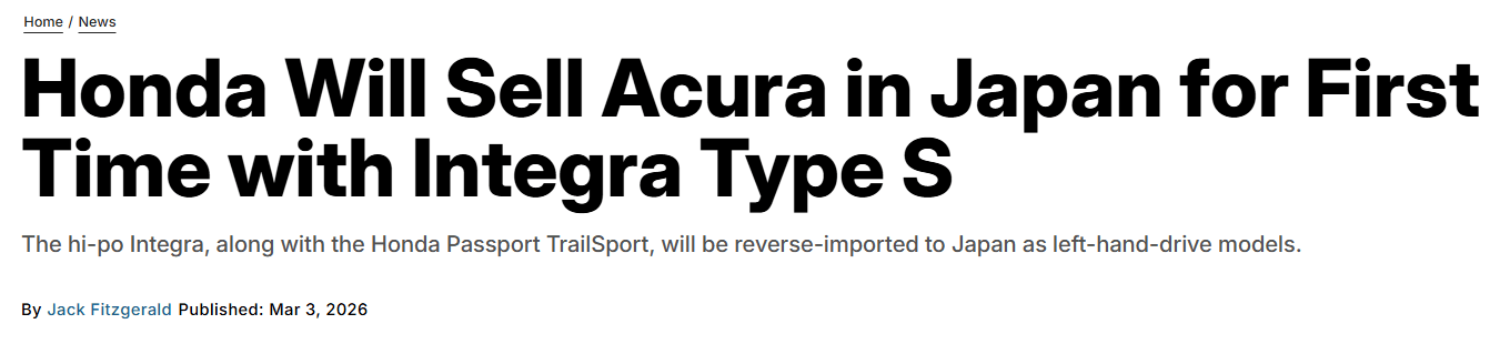 本田计划于2026年下半年,将两款美国制造车型引入日本展厅,分别是俄亥俄州工厂生产的讴歌Integra Type S,以及阿拉巴马州工厂生产的本田Passport Trail Sport Elite。