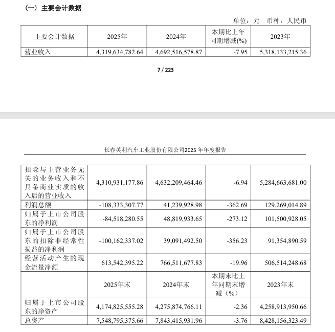 猫头鹰车志(ID:owlauto)讯,近日,长春英利汽车工业股份有限公司(下称:英利汽车)发布2025年年报。报告显示,英利汽车2025年实现营业收入43.20亿元,同比下降7.95%;实现归属于上市公司股东的净亏损达8451.83万元,较上年同期盈利4881.99万元大幅下降273.12%;实现扣非归母净利润为-1.00亿元,同比下降356.23%。