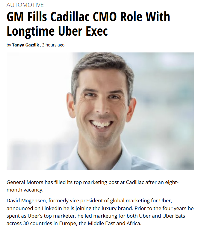 猫头鹰车志(ID:owlauto)讯,据媒体报道,通用汽车公司于近日正式任命Uber前全球营销副总裁 David Mogensen 担任凯迪拉克品牌首席营销官(CMO),这一职位已空缺长达 8 个月之久。Mogensen 将直接向凯迪拉克全球副总裁 Kristian Aquilina 汇报工作,全面负责该豪华品牌的全球广告策略、品牌推广、合作伙伴关系以及客户体验活动等核心营销事务。