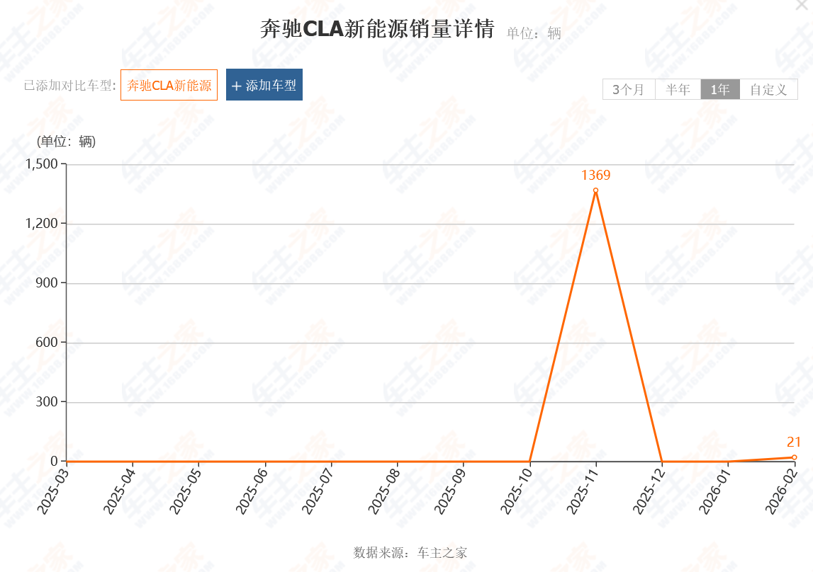 近日,全新梅赛德斯奔驰纯电CLA在中国市场的销量表现引发广泛关注。这款被寄予厚望的车型,自2025年11月初上市后,市场表现急转直下,据车主之家数据显示,从首月1369辆的销量,到2026年2月仅售出21辆,短短4个月便经历了“断崖式崩塌”。