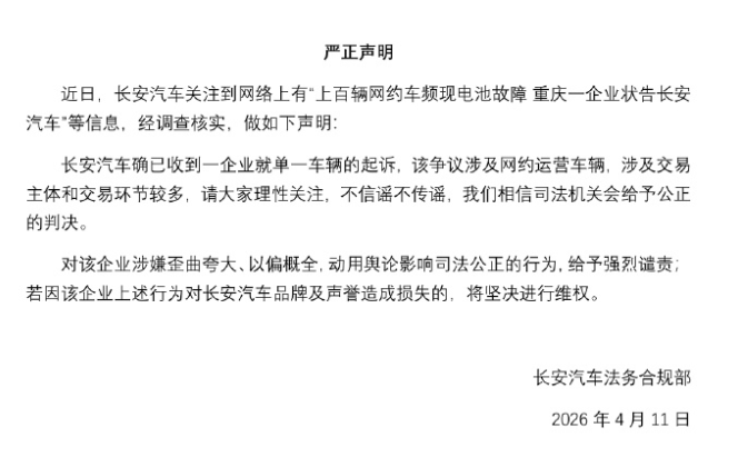 长安汽车回应上百辆网约车电池故障:事件被歪曲夸大!