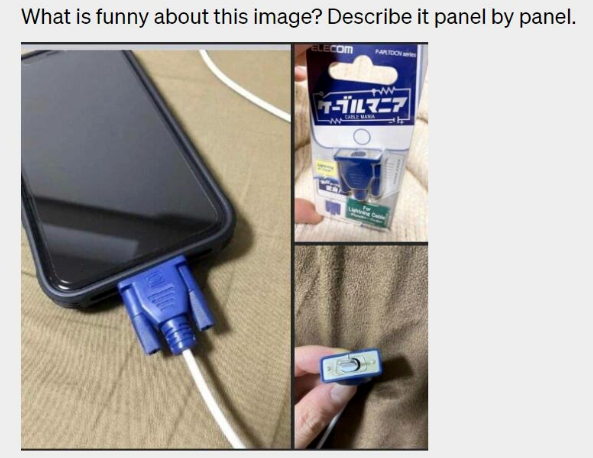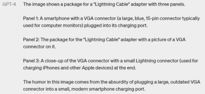 GPT-4可根据散布的图像和文本生成对应的自然语言或代码等输出。如文本与图片相结合的文档、图表或屏幕截图等。举例来说,给它一张长相奇怪的充电器的图片,GPT-4能够生成对应的答案,解释为什么这看起来很好笑。