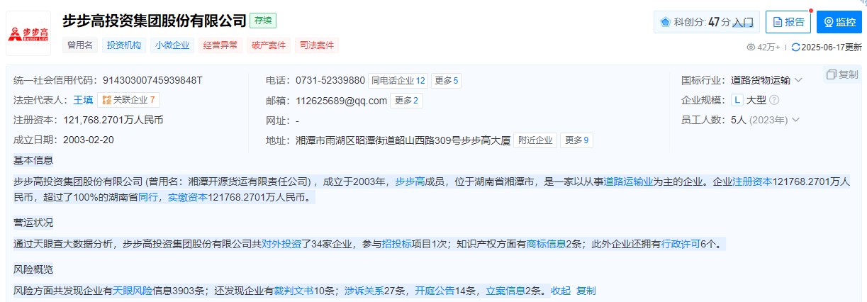 公开资料显示,步步高投资集团成立于2003年2月,法定代表人为王填,注册资本约12.18亿元人民币,经营范围涵盖投资及财务咨询、房地产信息咨询、商务信息咨询等业务。该公司由王填、长沙高晟投资合伙企业(有限合伙)等共同持股,是湖南地区较具规模的综合性投资集团。