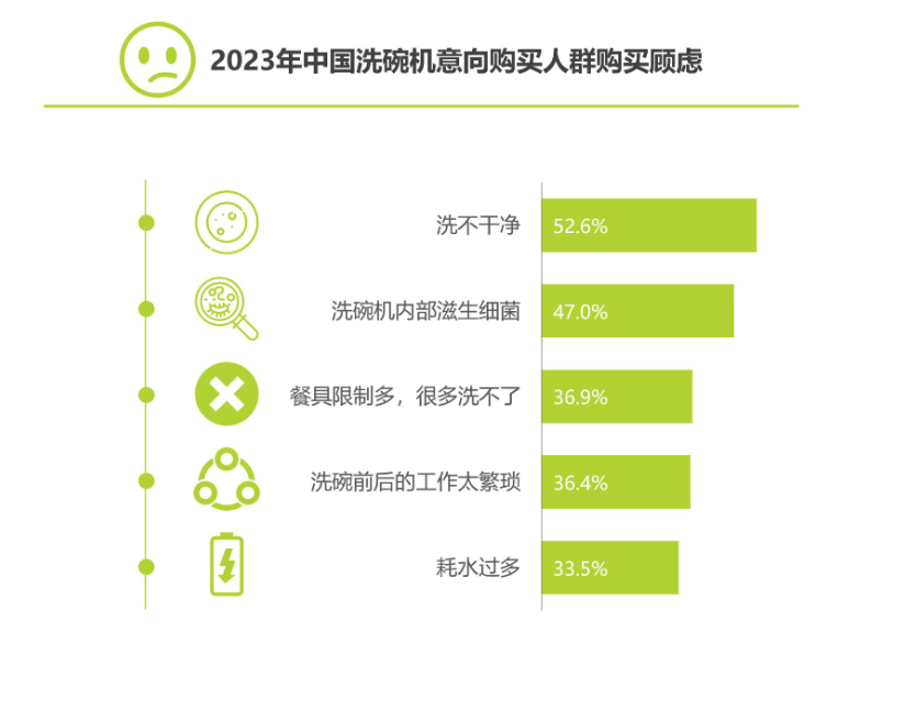 艾瑞咨询2023年的调查戳中了用户的痛点:超过半数(52.6%)有意购买洗碗机的人,最担心的就是洗不干净。一些消费者反映,洗碗之前得先冲掉餐具里的食物残渣,不然就等着回头去排水口抠残渣;凝结住的油酱、干掉的饭粒得提前刮掉,想洗干净全靠运气;蒸鸡蛋羹的碗更是洗碗机的 “一生之敌”,热水能去油,但对上蛋白质就是彻底 “踢到了铁板”,硬化后就死死粘在了碗上。在他们看来,洗碗机不仅不能完全解放双手,甚至还增加了一些额外的工作,这使得很多人对购买洗碗机持谨慎态度。