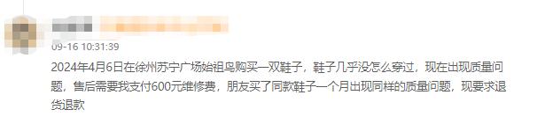 比如,有消费者在黑猫平台投诉称,去年在始祖鸟线下门店买的一双鞋子,平时几乎没怎么穿过,出现质量问题后需要花费600元维修,且“朋友买的同款鞋子一个月同样出现质量问题”。