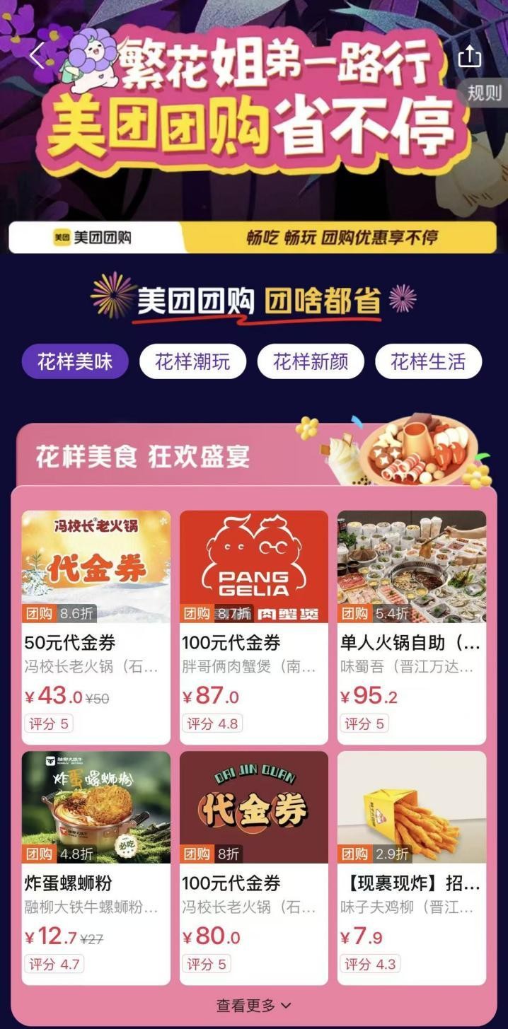 在节目外,美团团购还搭建了线上线下联动的营销闭环。在《一路繁花2》节目开播之际,美团团购联动全国百家花店同步开启庆开播活动,用满满的诚意给用户送惊喜。节目播出期间,美团团购还在站内推出了一路繁花同款页面,让观众能一键get繁花同款,帮助观众“所看即所得”,满足观众打卡同款的需求。
