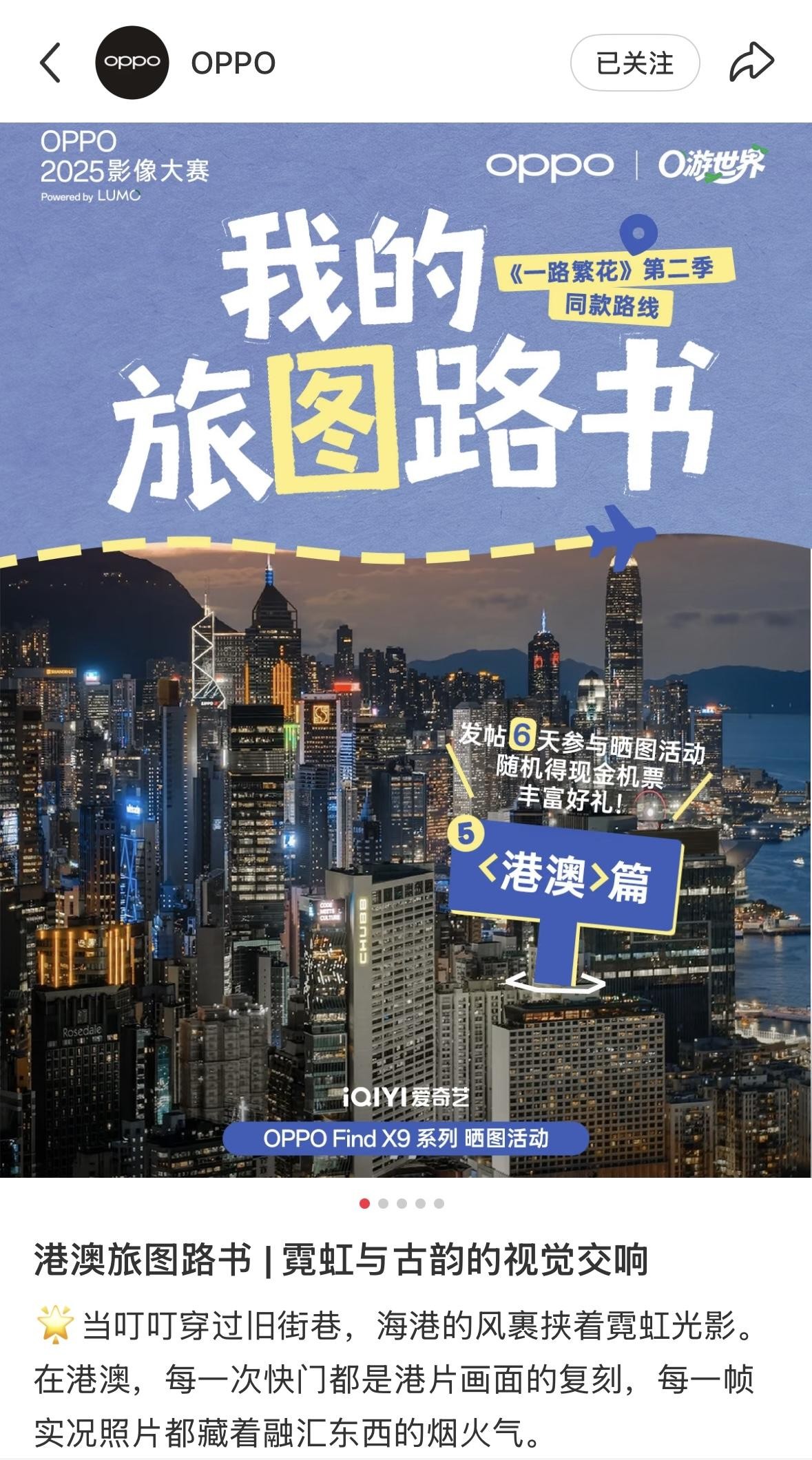 OPPO在小红书发布《一路繁花2》专属旅拍路书,不仅为用户提供同款旅行拍照攻略,还同步发起“OPPO2025影像大赛”,鼓励用户上传旅拍作品,既深度展示OPPO Find X9的影像实力,又通过UGC互动实现品牌声量的二次裂变,完成“专业种草-用户共创-流量沉淀”的多维链路。