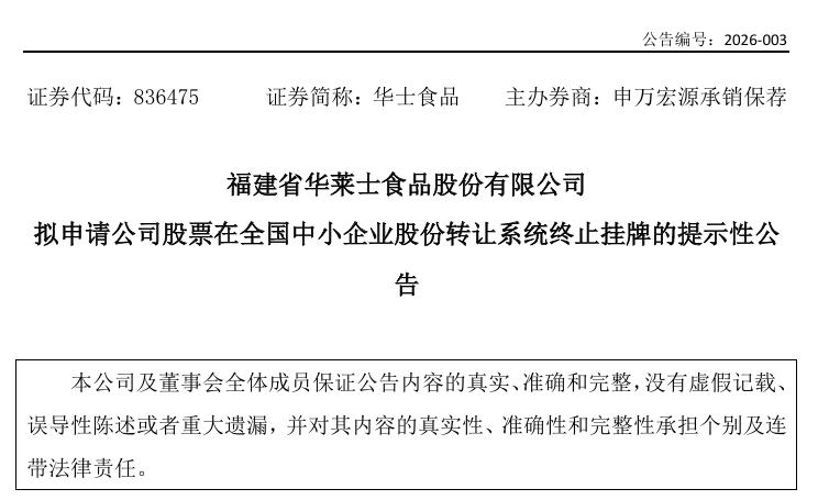 2026年1月9日,华莱士母公司华士食品发布了拟申请股票终止挂牌的公告,华士食品给出的理由是进一步提高经营决策效率,降低经营成本。2026年1月26日,华士食品召开临时股东会议审议通过了终止挂牌的议案。
