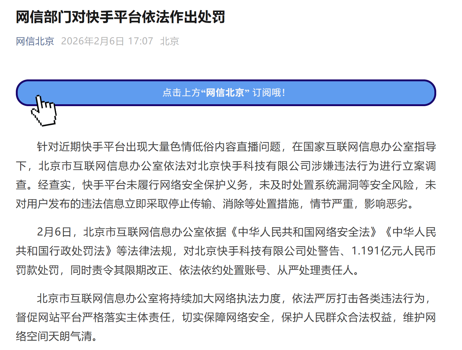 北京市互联网信息办公室依据《中华人民共和国网络安全法》《中华人民共和国行政处罚法》等法律法规,对北京快手科技有限公司处警告并处1.191亿元罚款,同时责令其限期改正、依法依约处置账号、从严处理责任人。
