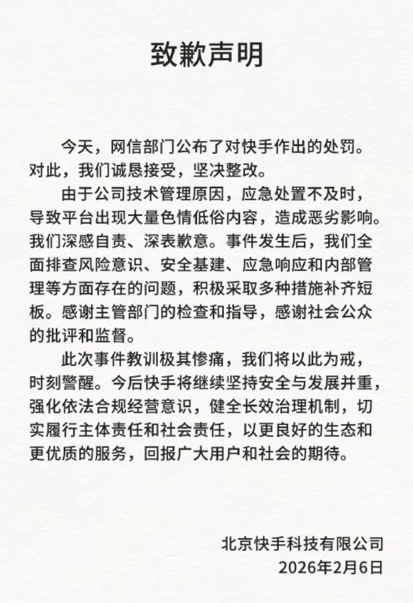 随后,快手发布致歉声明称:“今天,网信部门公布了对快手作出的处罚。对此,我们诚恳接受,坚决整改。由于公司技术管理原因,应急处置不及时,导致平台出现大量色情低俗内容,造成恶劣影响。我们深感自责、深表歉意。事件发生后,我们全面排查风险意识、安全基建、应急响应和内部管理等方面存在的问题,积极采取多种措施补齐短板。感谢主管部门的检查和指导,感谢社会公众的批评和监督。”