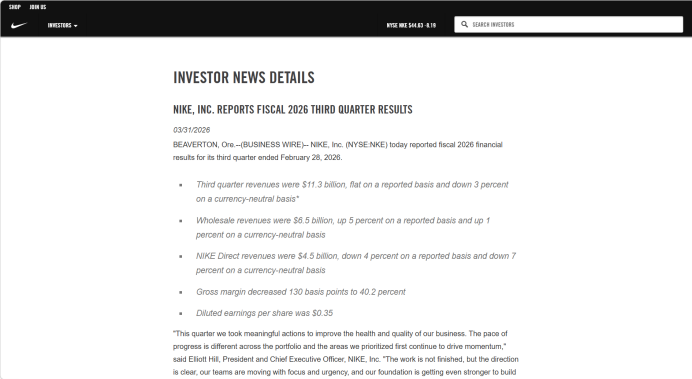 3月31日,耐克发布了截至2026年2月28日的2026财年第三季度业绩。报告期内,耐克实现营业收入112.79亿美元,与上年同期基本持平;实现净利润5.20亿美元,同比减少35%。