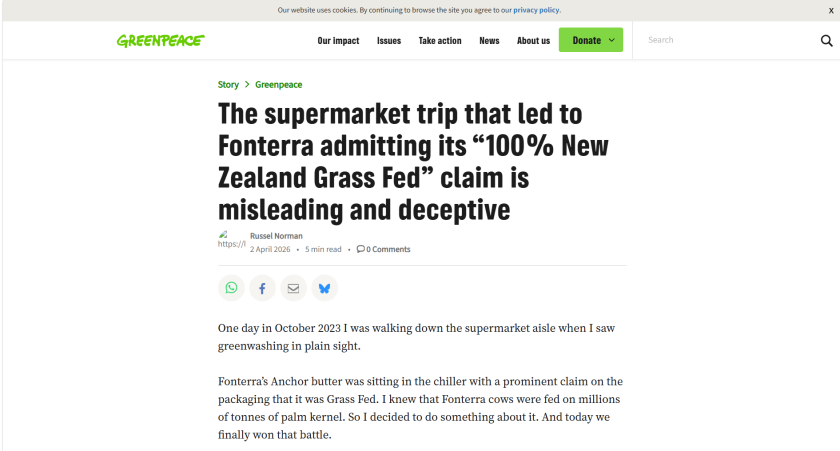 Greenpeace (绿色和平组织)官网发文称,恒天然承认“100%新西兰草饲”的宣传违反了《公平交易法》第九条,并承诺不再使用该标签。