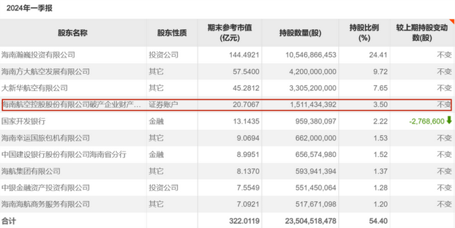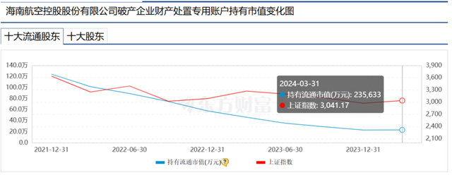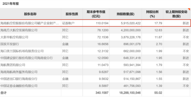 于是,在2021年年报的十大股东中,多出来了下面这个账户:海南航空控股股份有限公司破产企业财产处置专用账户,当时持股数量接近60亿股,持股市值110亿元。