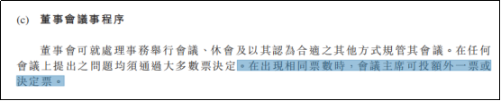 “董事会议事程序”中这么说明:董事会在任何会议上提出之问题均须通过大多数票决定;在出现相同票数时,会议主席可额外投外一票或决定票。