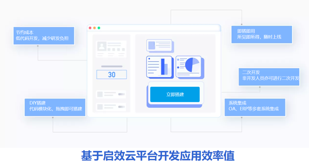 积木式应用搭建,同时具备代码开发和外部系统集成能力。