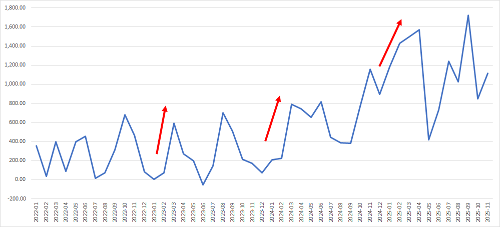 根据历史上南下资金“年末降速、年初跳升”的规律,2025年底南下资金流入减速,是年末资金获利了结、风控收敛和观望情绪叠加的阶段性放缓。2026年初,南向资金有望重回高速流入态势,从“防御性撤退”转向“进攻性加仓”,科技类资产(如港股互联网)或将是偏好的方向之一。