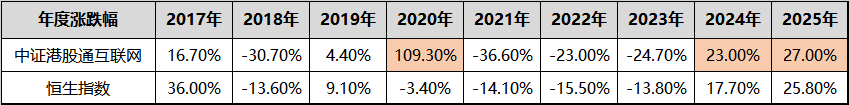 在2020年、2024年及2025年港股上涨行情中,港股通互联网指数均跑赢恒生指数,提供了获取较高收益的可能。尤其是2020年该指数大涨109.30%,同期恒生指数则下跌了3.4%。