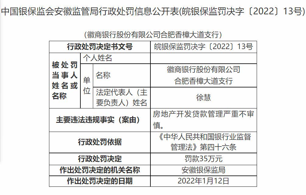 徽商银行合肥香樟大道支行因房地产开发贷款管理严重不审慎被罚35万。