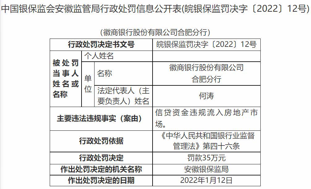 罚单显示,徽商银行合肥分行因信贷资金违规流入房地产市场被罚35万。