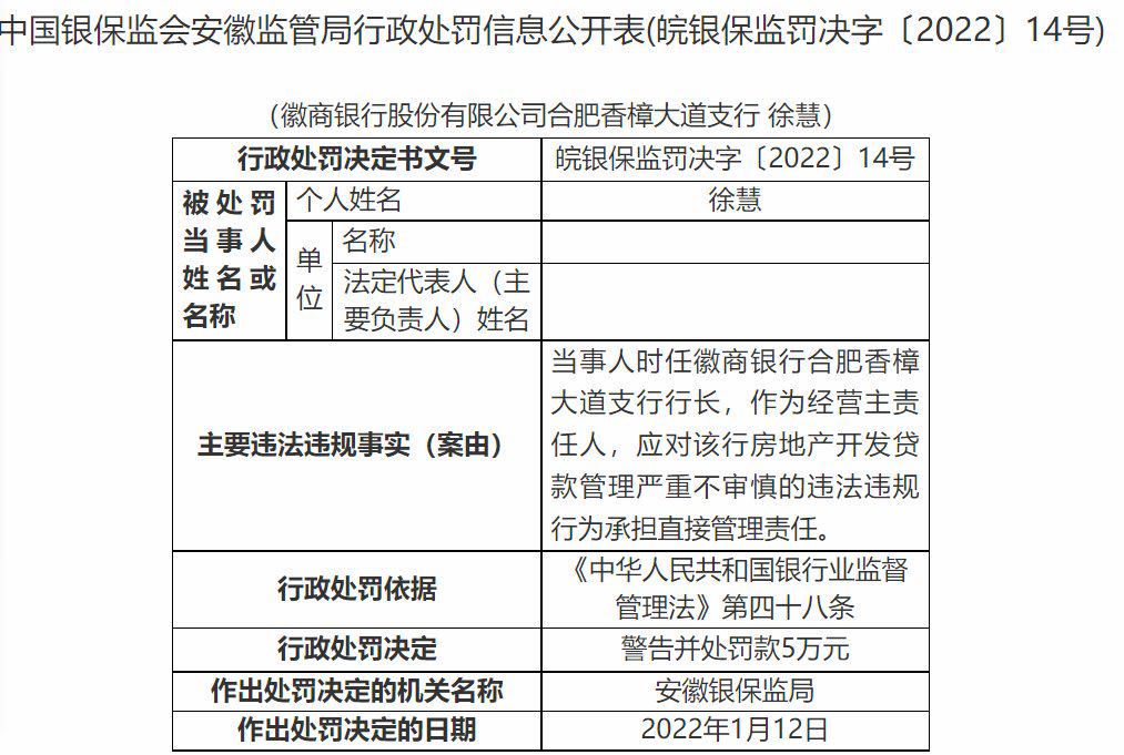 同时,时任徽商银行合肥香樟大道支行行长徐慧作为经营主责任人,应对该行房地产开发贷款管理严重不审慎的违法违规行为承担直接管理责任被警告并罚款5万。