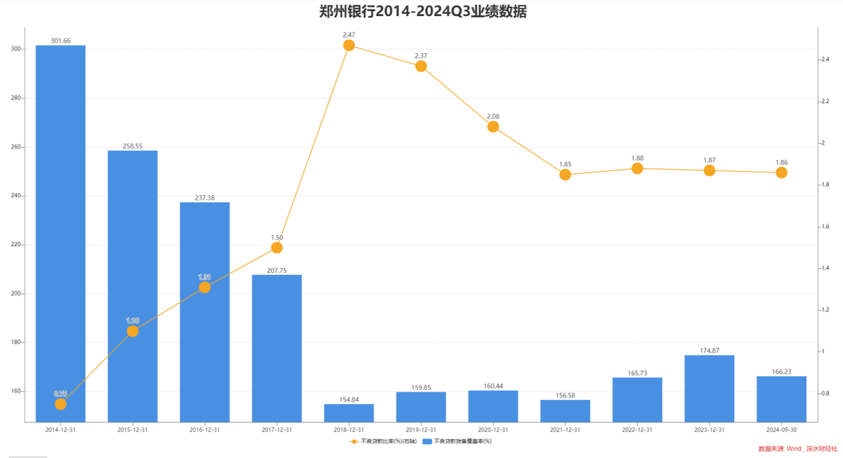 资产质量是衡量银行健康程度的重要指标之一。截至2024年三季度末,郑州银行不良贷款率1.86%,较年初下降0.01个百分点;拨备覆盖率166.23%,资本充足率12.29%。