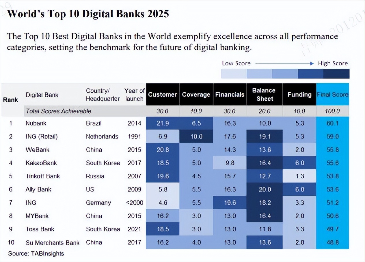 具体来看,“2025全球纯数字十强银行”分别为:巴西Nubank、荷兰ING(Global)、中国微众银行、韩国KakaoBank、俄罗斯Tinkoff Bank、美国Ally Bank、德国ING、中国网商银行、韩国Toss Bank、中国苏商银行。