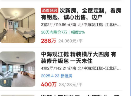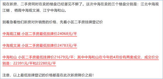 以仙林的中海观文澜为例,本楼盘同类型的二手房价格已经低至24000/平,中海观江樾二手房价格也与观文澜差不多,中海观山樾最低挂牌价已经到21000多/平了,最近的成交价在22000多/平。