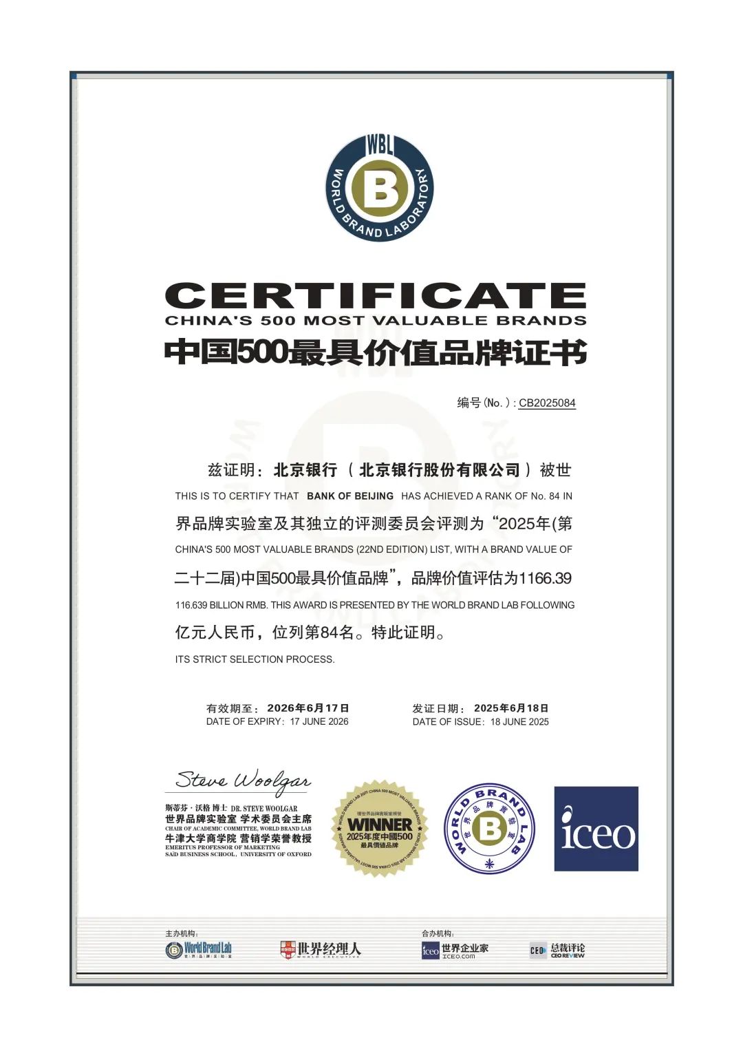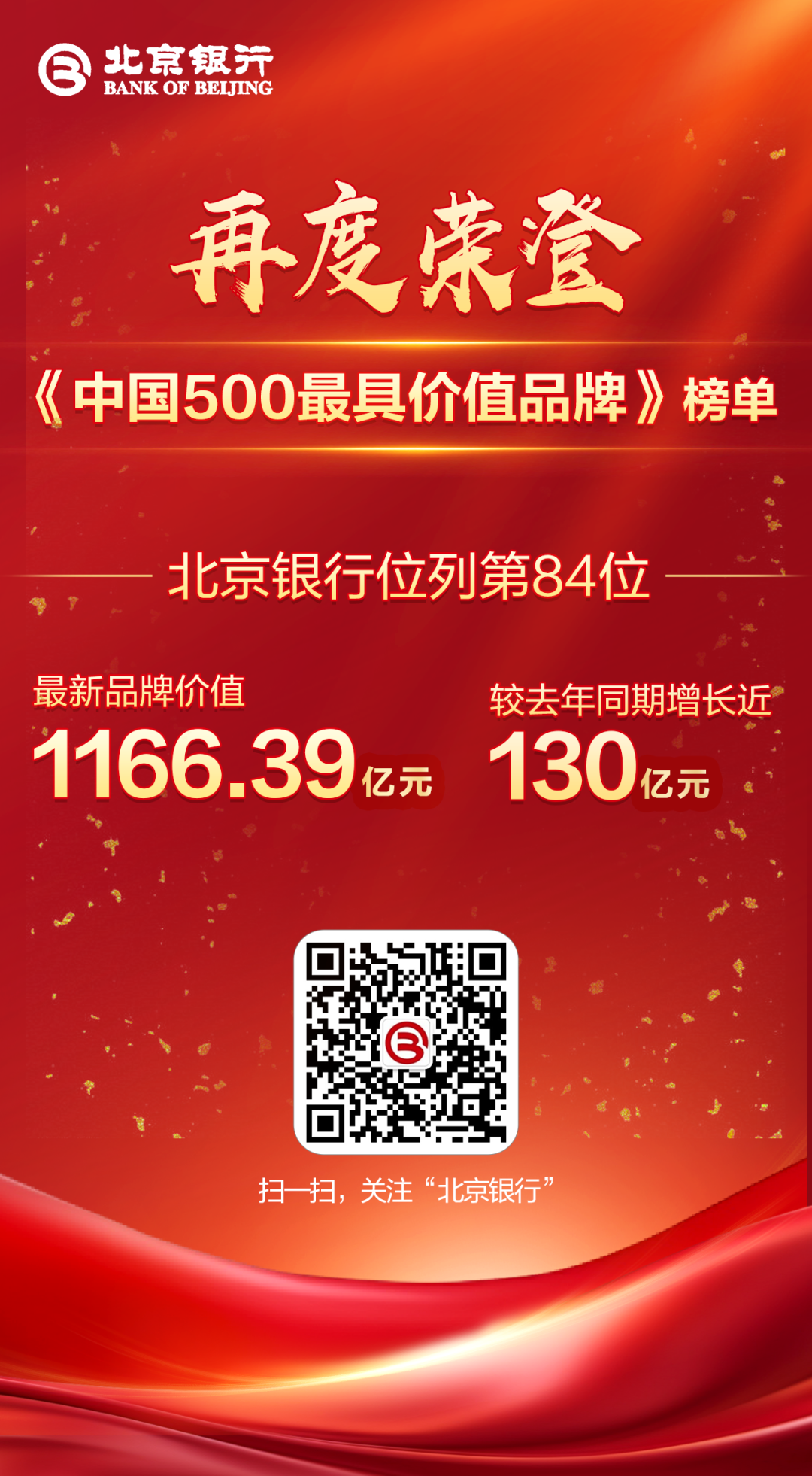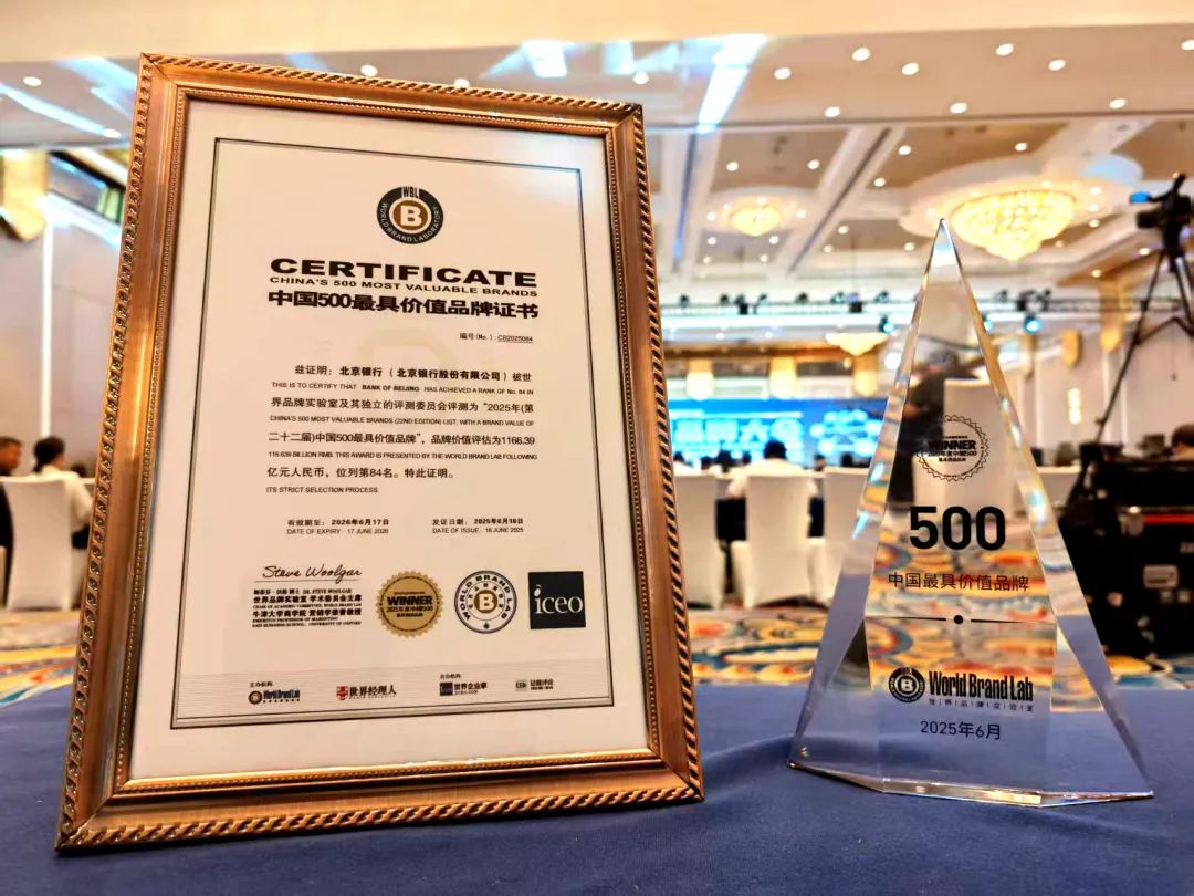 6月18日,由世界品牌实验室(World Brand Lab)主办的第22届世界品牌大会在北京举行,活动现场发布了2025年《中国500最具价值品牌》榜单。在这份基于分析的年度报告中,北京银行凭借强劲的品牌实力,再次荣耀登榜——最新品牌价值提升近130亿元,达1166.39亿元,位列第84位,较去年提升1位,品牌价值与品牌影响力取得双重突破。