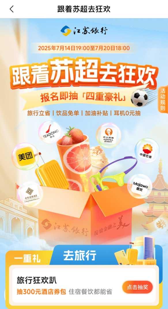 7月14日,江苏银行APP上线了最新版“跟着苏超去狂欢”球迷专区,专区里推出了“四重豪礼”活动,让球迷不光能抢票看球,还能享受各地的优惠菜单,让球迷开心的吃喝玩乐。