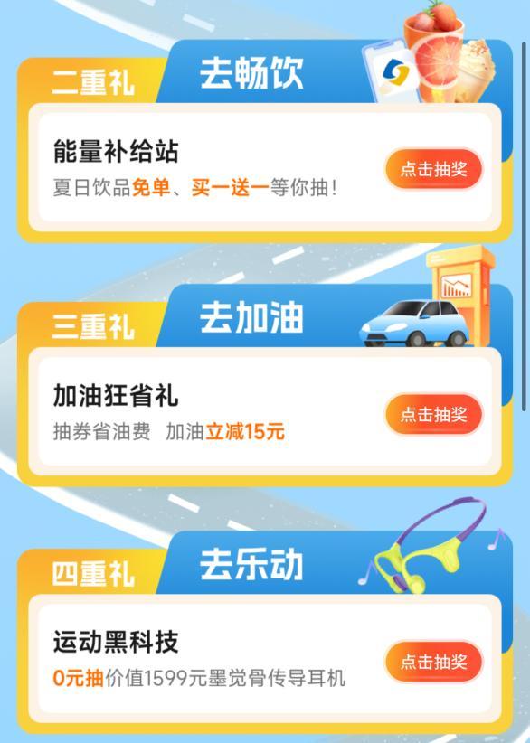 登录App进入“跟着苏超去狂欢专区”或进入“足球联赛专区”点击“更多福利”,即可每周在“旅行、畅饮、加油、乐动”四大专区各抽奖1次,奖品涵盖旅行优惠、饮品福利、加油补贴及运动装备,真正实现“看球更尽兴,生活更省心”。