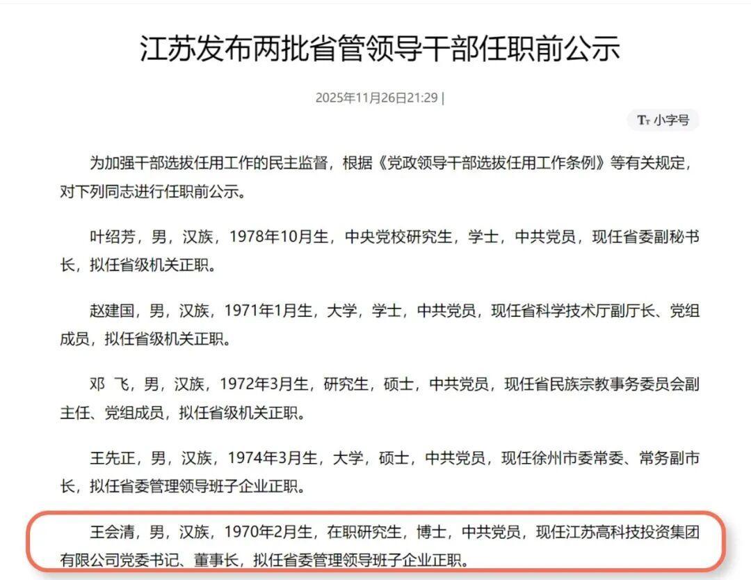 虽尚未正式公布,但11月26日江苏省委组织部发布的20名干部任前公示中已提及江苏高投党委书记董事长王会清,拟任省委管理领导班子企业党委书记。