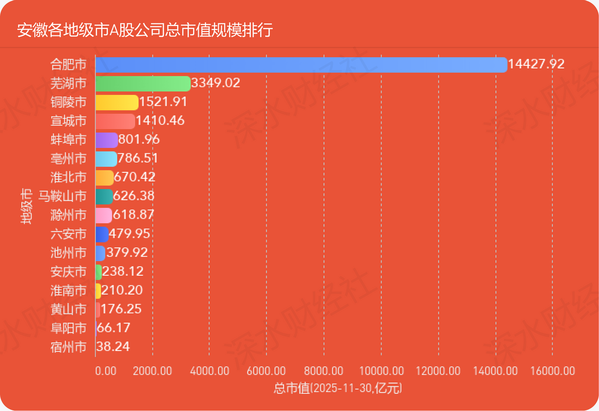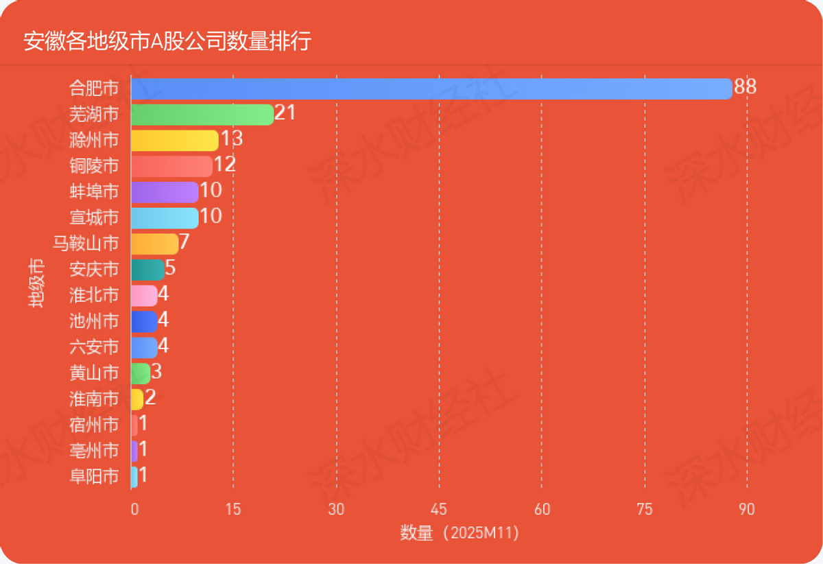 据深水财经社发布的2025年11月安徽上市公司发展报告数据,截至11月末,滁州市共有13家A股上市公司,在安徽各地级市中排名第三;总市值618.87亿元,位居第九位。