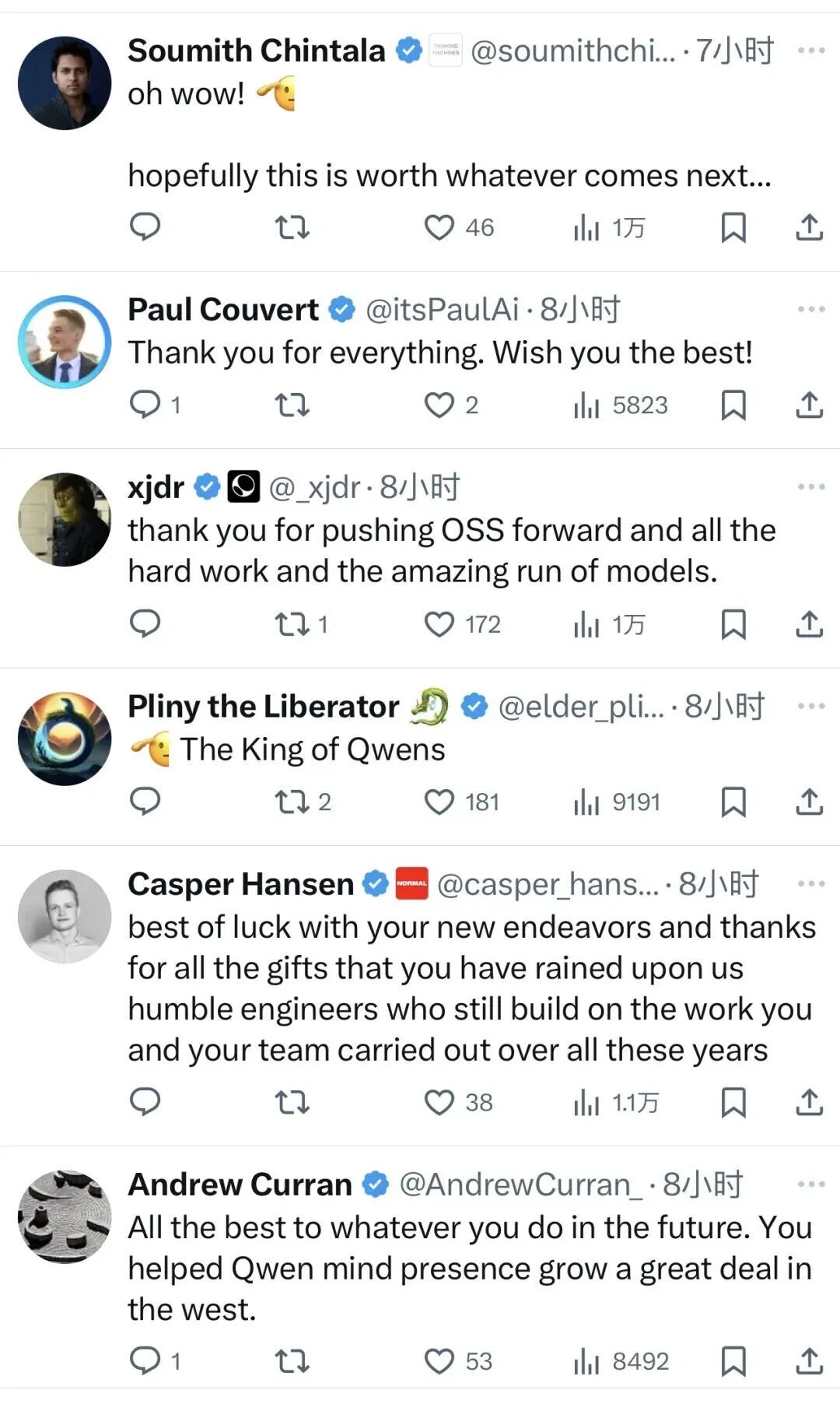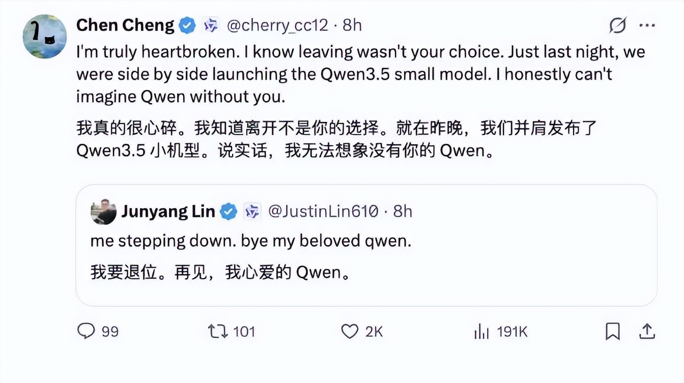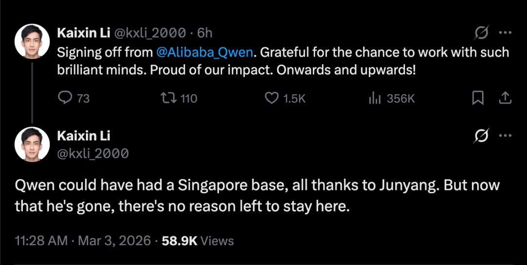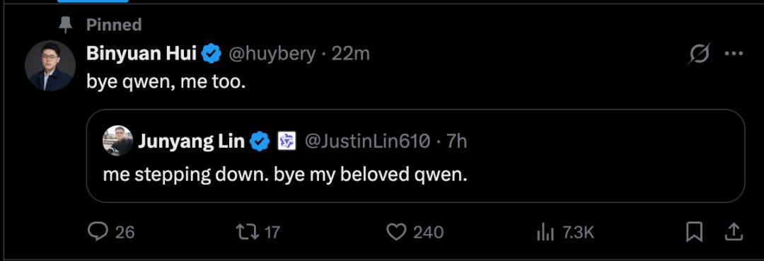 他刚宣布离开不久,千问核心贡献者李凯新也在X上发帖告别。紧接着,长期活跃在X平台的通义实验室科学家慧彬原也于今早发文告别千问。