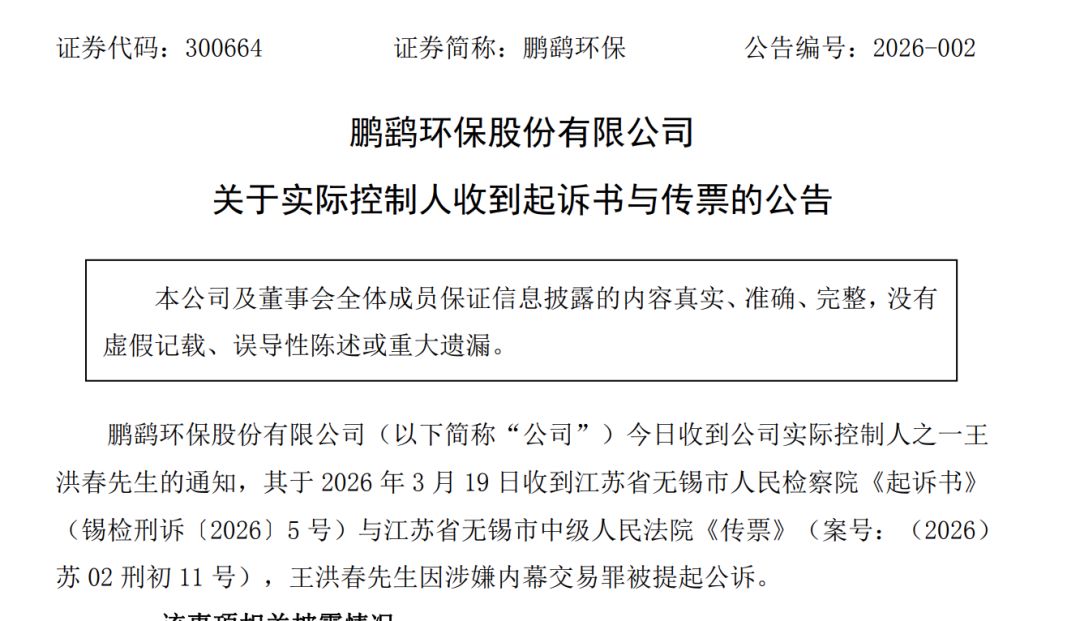 3月20日晚间,创业板上市公司鹏鹞环保发布公告,披露公司实际控制人之一王洪春于3月19日收到江苏省无锡市人民检察院《起诉书》与无锡市中级人民法院《传票》,其因涉嫌内幕交易罪被正式提起公诉。