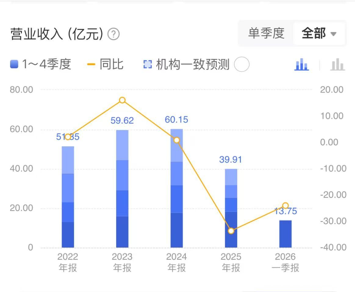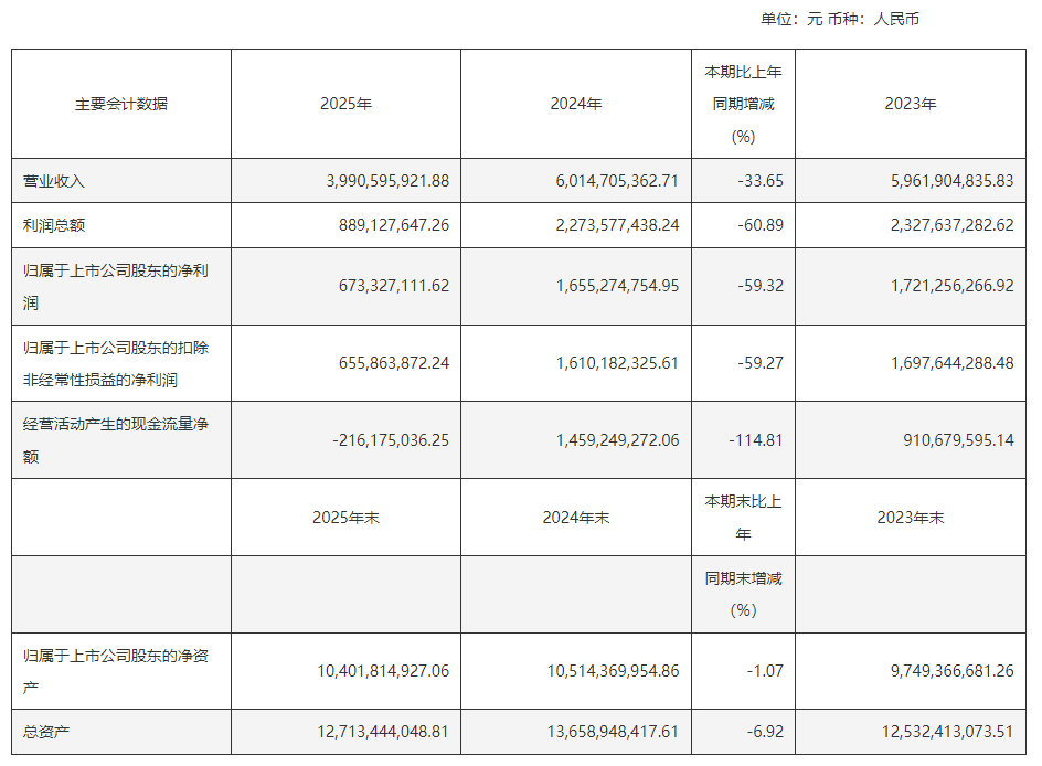 2026年4月23日,口子窖交出了上市以来最惨淡的一份成绩单。全年实现营业收入39.91亿元,同比下跌33.65%;归母净利润仅为6.73亿元,同比下跌59.32%,创下十年来的最低值。