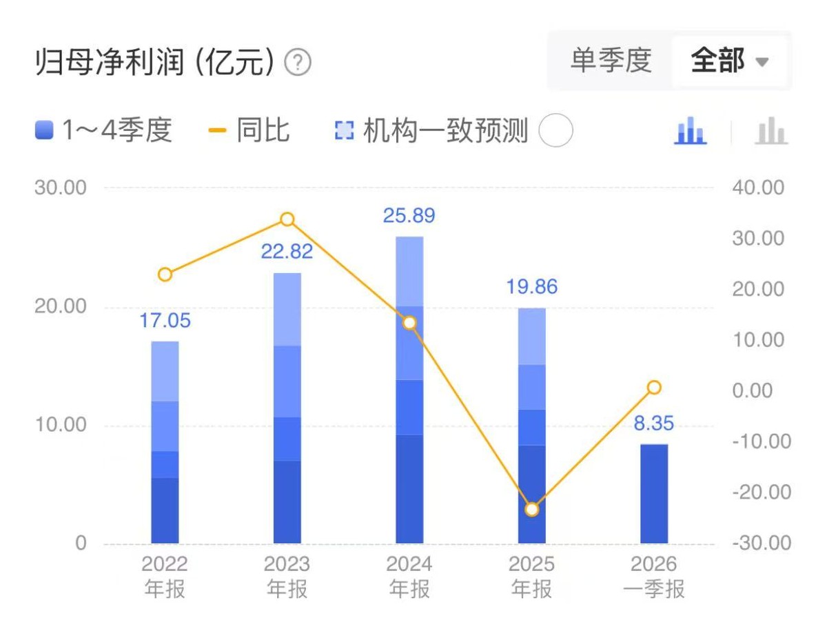 更关键的是,2026年一季度,迎驾贡酒营收同比增长8.91%至22.3亿元,归母净利润同比增长0.73%至8.35亿,经营端率先筑底回升。
