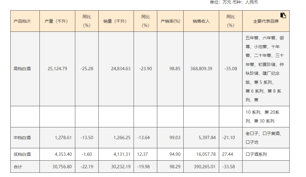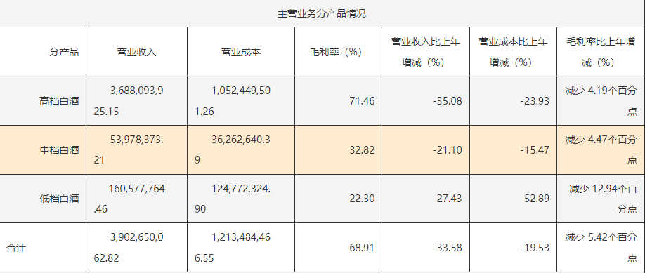 中档白酒收入仅0.53亿元,同比下滑21.10%;低档白酒虽增长27.43%至1.6亿元,但占比不足5%,对于总营收来说意义不大。