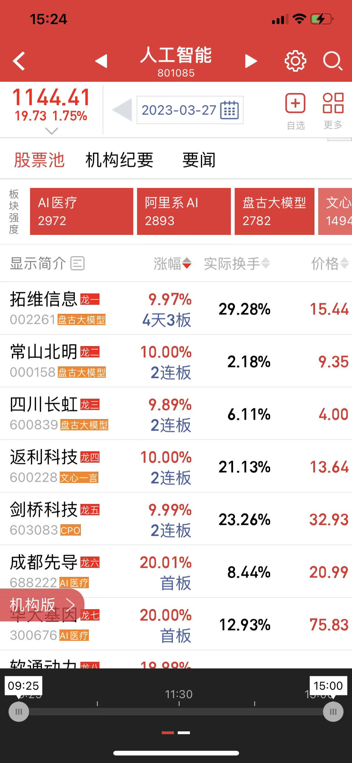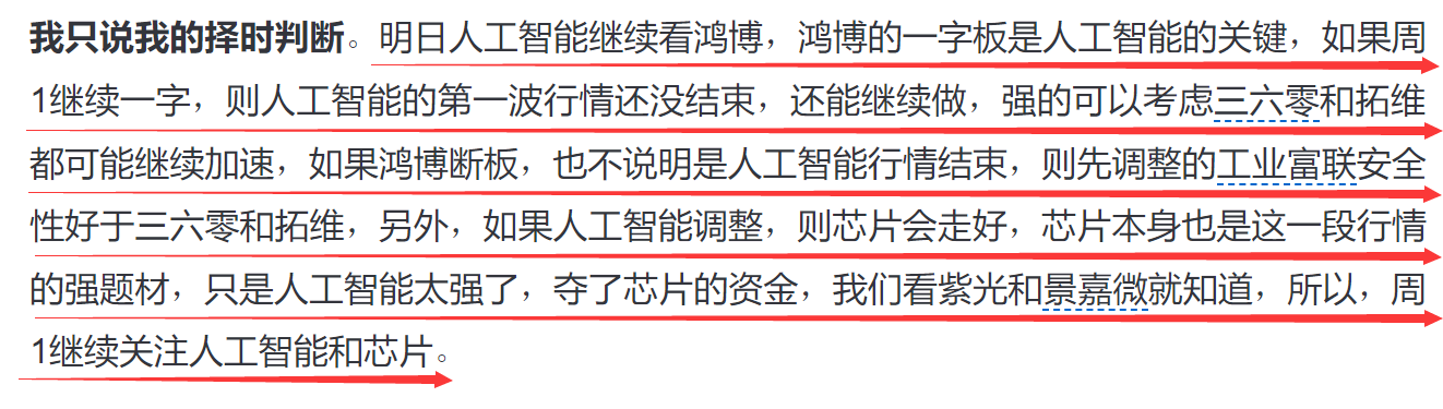 明日策略:每个人有每个人的交Y节奏,我只提示我的交Y节奏,如果你依此操作被套,不要来抱怨我,交Y是很私人的事情,你M银行G的节奏和短X连BG的节奏,那肯定不一样,我只说我的择时判断。明日还是人工智能和芯片,从今天的盘面来看,明日人工智能继续反包向上概率较大,鸿博明日竞价是否跳空是一个判断标准,三六零的正常预期是低开,红开则超预期,另外芯片也是明日重点观察对象,如果竞价人工智能走弱,可以考虑芯片,2者是目前的绝对主线。