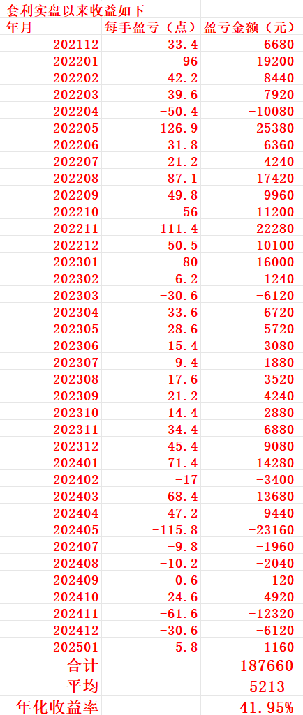 如图,收盘后以结算价计算的本轮套利交易的收益暂时为每手-5.8个点,即每手亏损1160元,周五每手实现收益(-3.6)*200=-720元。过去三十六个月套利总盈利为每手187660元,月平均盈利为每手5213元,年化收益率为41.95%。