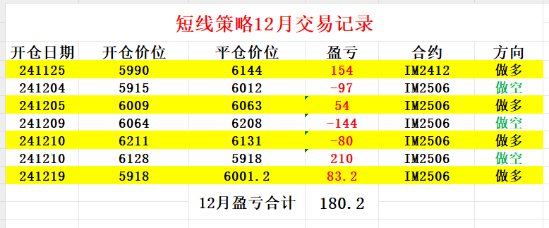 短线投机交易周五没有操作,我继续持有IM2506多头头寸,仓位一手,以结算价计算该笔交易周五单日盈利10240元,到周五为止该笔交易每手共盈利16640元。截至周五12月短线投机交易一共盈利180.2个点即36040元,交易记录及操作过程如图所示。