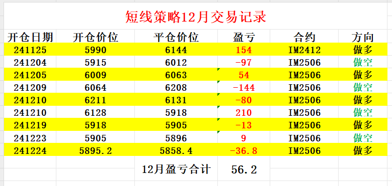 短线投机交易今天没有操作,我继续持有IM2506多头头寸,仓位一手,以结算价计算该笔交易今天单日亏损8120元,到今天为止该笔交易每手共亏损7360元。截至今天12月短线投机交易一共盈利56.2个点即11240元,交易记录及操作过程如图所示。