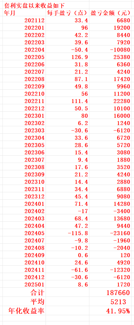 如图,收盘后以结算价计算的本轮套利交易的收益暂时为每手8.6个点,即每手盈利1720元,周五每手实现收益(1.4)*200=280元。过去三十六个月套利总盈利为每手187660元,月平均盈利为每手5213元,年化收益率为41.95%。