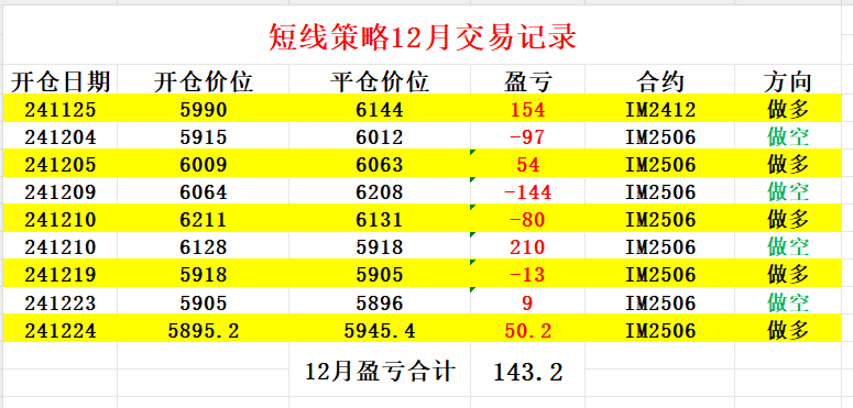 短线投机交易周五没有操作,我继续持有IM2506多头头寸,仓位一手,以结算价计算该笔交易周五单日盈利3560元,到周五为止该笔交易每手共盈利10040元。截至周五12月短线投机交易一共盈利143.2个点即28640元,交易记录及操作过程如图所示。