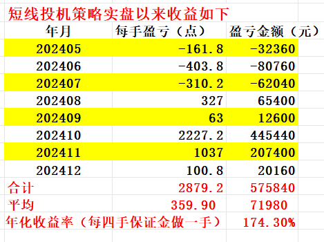 如图,截至2024年12月,短线策略实盘以来的八个月总盈利为每手57.58万元,月平均盈利为每手7.19万元,年化收益率(按每四手保证金做一手合约计算)为174.3%。八个月以来策略运行正常,月平均收益和年化收益率与历史平均值接近。