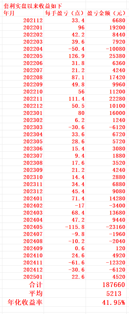 如图,收盘后以结算价计算的本轮套利交易的收益暂时为每手22.6个点,即每手盈利4520元,今天每手实现收益(2.2)*200=440元。过去三十六个月套利总盈利为每手187660元,月平均盈利为每手5213元,年化收益率为41.95%。