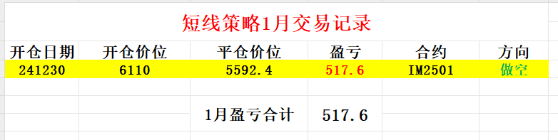 短线投机交易今天没有操作,我继续持有IM2501空头头寸,仓位一手,以结算价计算该笔交易今天单日盈利9200元,到今天为止该笔交易每手共盈利103520元。截至今天1月短线投机交易一共盈利517.6个点即103520元,交易记录及操作过程如图所示。